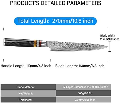 【VG10 Japanese Damascus Excessive Carbon Metal&Finest Reducing Edge】67-Layers solid VG-10 Japanese premium Damascus metal ensures this Japanese utility knife with a excessive stage of rust-resistance, wear-resistance and long-lasting efficiency. VG-10 Japanese tremendous metal chopping core at 62+ Rockwell hardness. Minimal Slicing Resistance