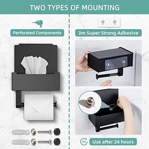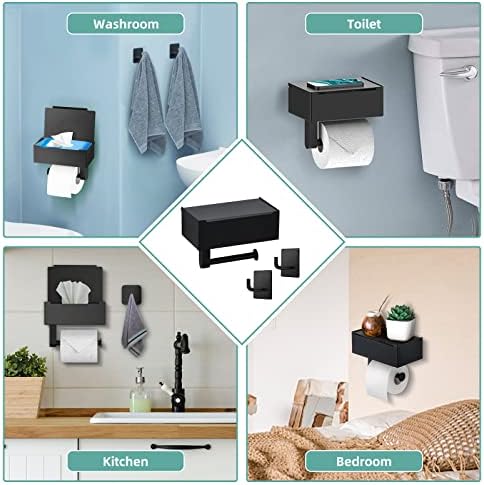 VTVTKK Bathroom Paper Holder with Shelf and Storage + 2 Pack Towel Gown Hooks, Matte Black Bathroom Paper Holders, Flushable Wipes Dispenser Toilet, Adhesive or Screw Wall Mount Bathroom Paper Roll Holder