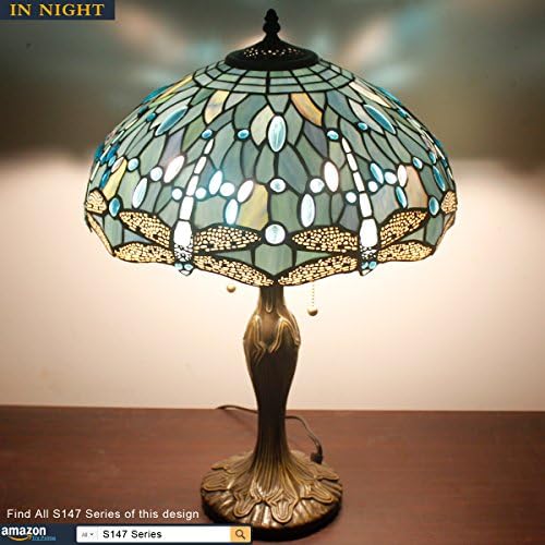 WERFACTORY Tiffany Lamp Sea Blue Stained Glass Bedside Desk Lamp Dragonfly Type Desk Studying Gentle Steel Base 16X16X24 Inches Decor Bed room Dwelling Room Dwelling Workplace (LED Bulb Included) S147 Collection