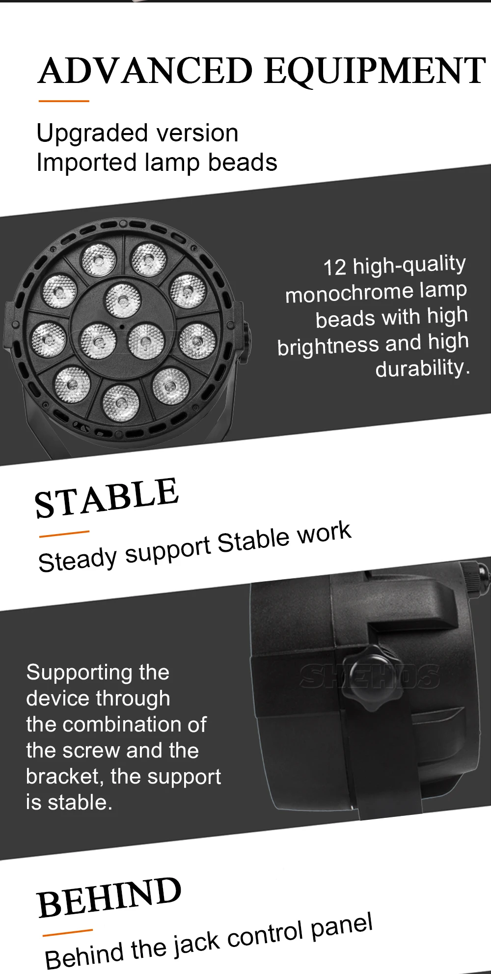 * Operational Modes: DMX512,Auto Run,Sound action,Strobe,Stand Alone and Master/Slave,With Rich Advanced Built-in Programs