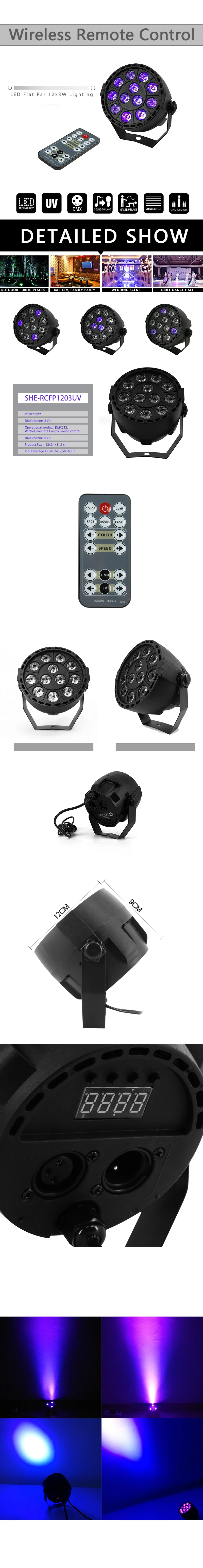 Specification: Wireless Remote Control RGBW 12x3W UV Disco Wash Flat Light Equipment 8 Channels DMX 512 LED Uplight Stage Lighting Effect Light