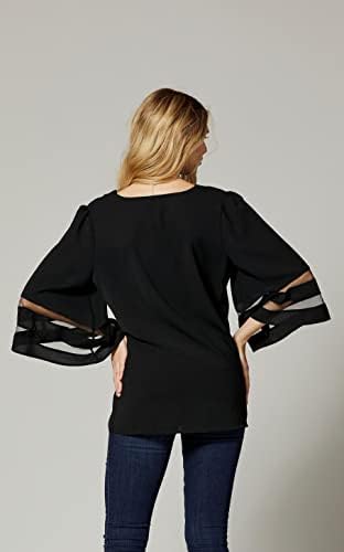 Ladies’s V Neck Bell Sleeve Shirt with Mesh Panel 3/4 Unfastened Shirt Flowy Prime