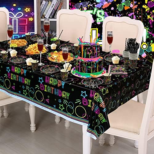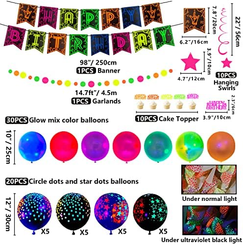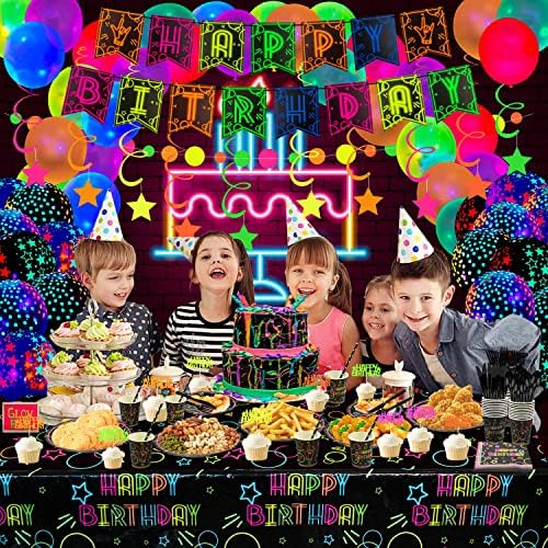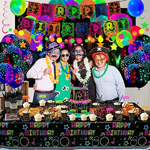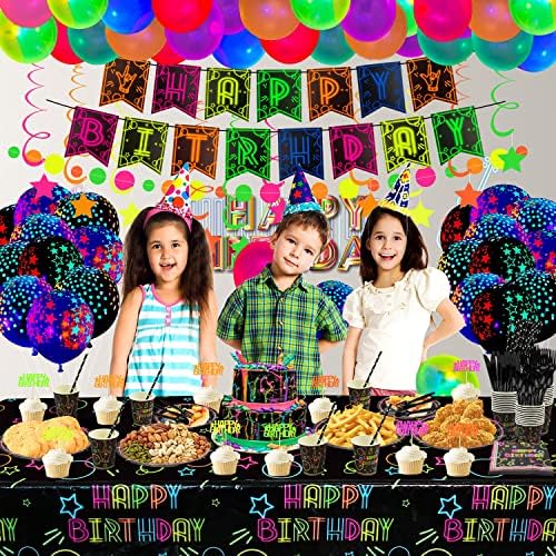 XJLANTTE Glow Neon Occasion Provides – Neon Balloon, Glow within the Darkish Joyful Birthday Banner, Hanging Swirls, Cake Topper, Plates, Napkins, Cup for Blacklight Occasion Decorations, Serves 20 Visitor