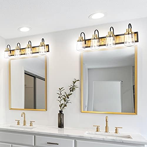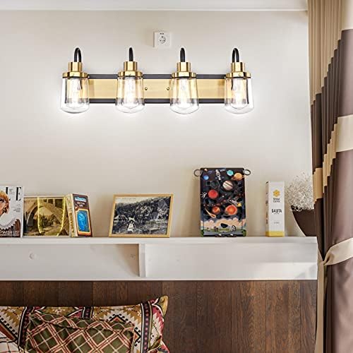 YAOHONG Trendy Toilet Self-importance Gentle, Black Self-importance Gentle with Brass Accent, 4-Bulb Indoor Wall Lamp, Farmhouse Wall Gentle Fixture with Clear Glass Shades