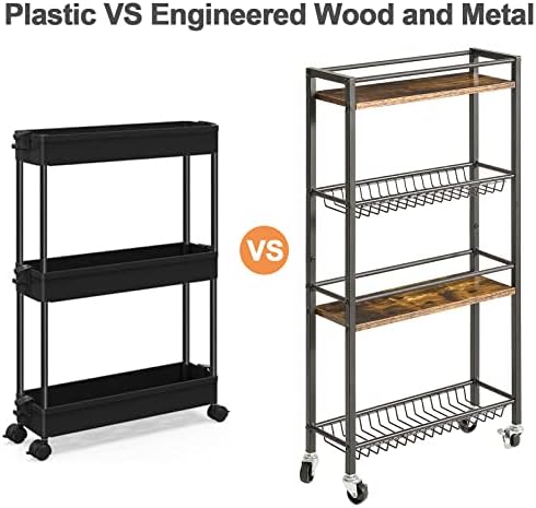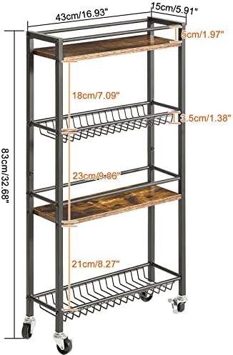YMYNY Slim Kitchen Storage Rolling Cart, 4-Tier Utility Cart on Wheels, for Slender Areas, Laundry Room, Eating Room, Toilet, 32.7″ H Shelving Unit with Mesh Baskets, Rustic Brown HBR002H