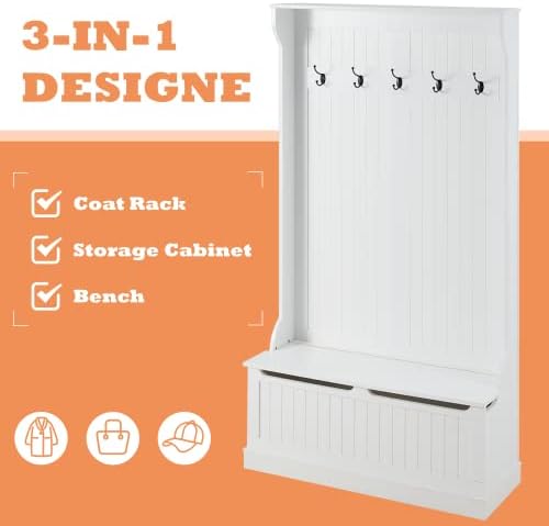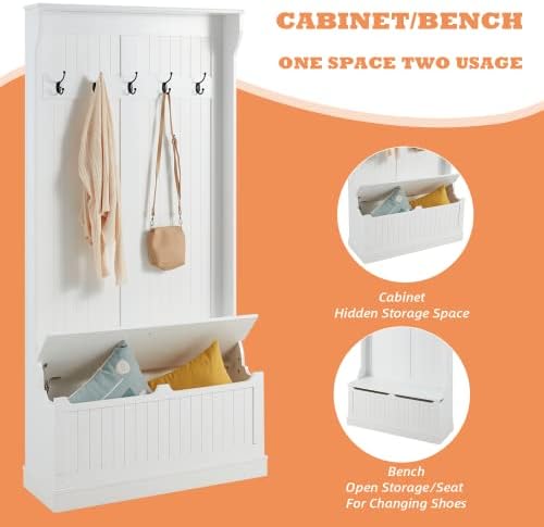 【3-IN-1 DESIGN HALL TREE】: A conventional fashion corridor tree with a storage cupboard, sitting bench, and coat rack appropriate to your entryway or lounge.