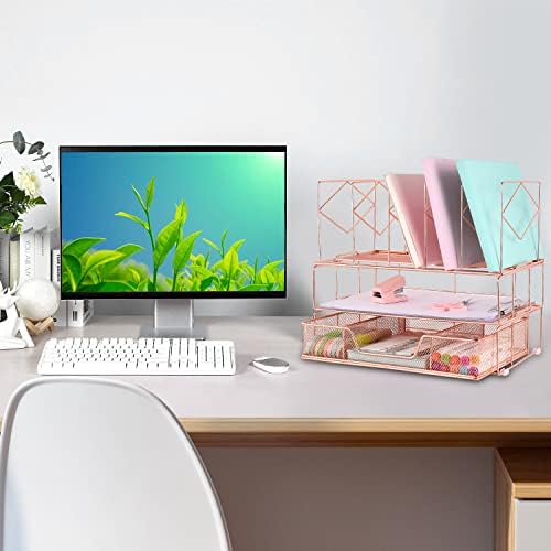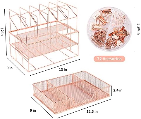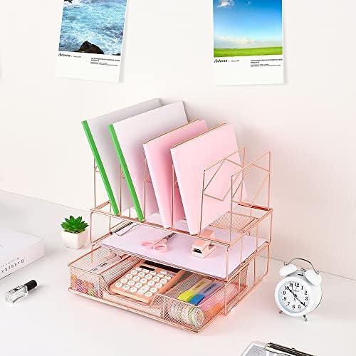 Youbetia Rose Gold Desk Organizers, All in One Desktop File Organizer with File Sorters + Drawer, Desk Equipment & Workspace Organizers with Paper Tray for Workplace Provides(Binder Clips Included)